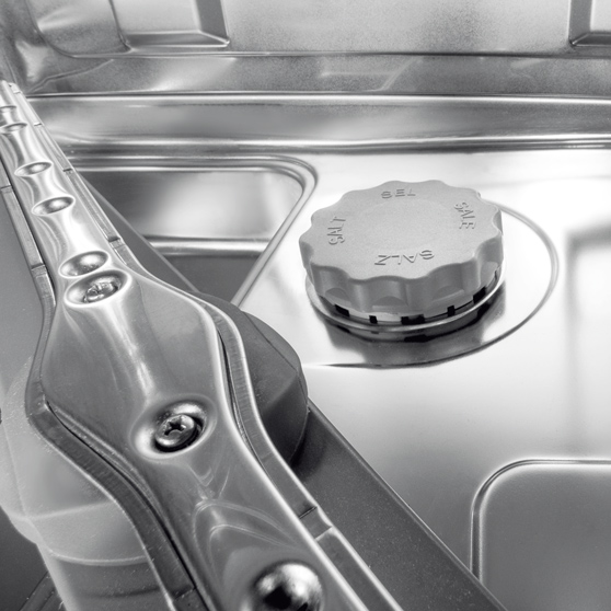 The optional integrated water softener removes hardening minerals from the water. This prevents calcification that can lead to longer programme execution times, burnt heating elements and poor wash results.