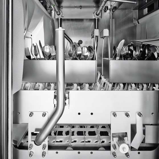 Work-intensive steps such as separately collecting and pre-soaking cutlery frequently contribute to slowing down and impeding the cleaning process. The optionally available cutlery cycle puts an end to this. Specifically developed cutlery baskets and intelligent sensors make sure that the cutlery is identified automatically by the machine. Hence, the dishwashing system automatically adapts the wash and rinse parameters in such a way that an optimum cleaning result is achieved.