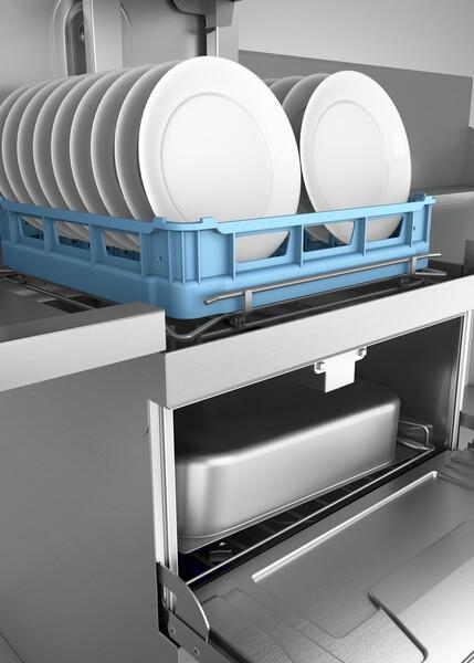 - Improves kitchen efficiency, and reduces clutter in the drop off zone, by simultaneously washing different types of ware